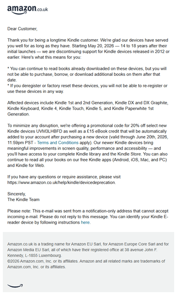 Earlier last week I, like many Amazon customers, received an email from Amazon about my Kindle e-reader device: